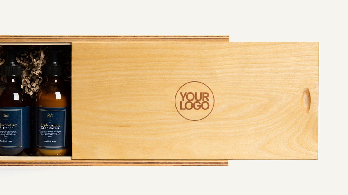 For an additional fee, we'll not only brand your sample products, but we'll also engrave your salon logo into your retail display box. We have a selection of ready-to-go label templates to pick from, or you can download the artwork guide-lines to send to your designer
